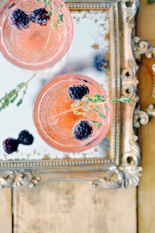3. Top with champagne and add in a sprig of thyme and 2 blackberries!